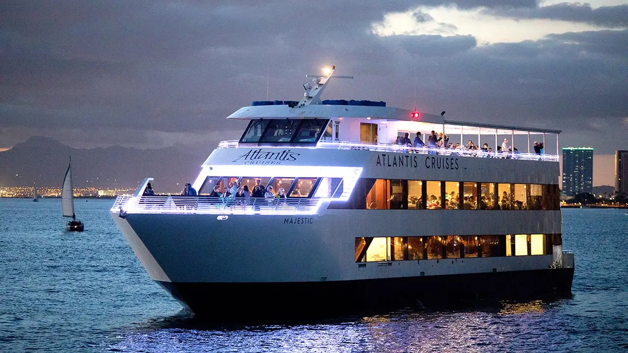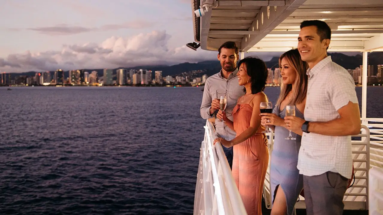 See spectacular sunset and city lights views aboard the Majestic, Hawaii’s only full-service bar and lounge on the sea.