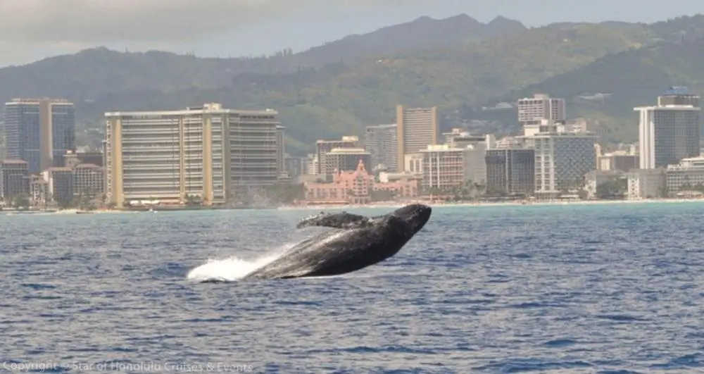 Star of Honolulu - Oahu Early Bird Whale WatchWhale watching in Oahu is available from 01-03 To 03-21. There are NO whale watching tours at any other time.Experience Whale watching in Hawaii, one of the most popular activities in the winter! Cruise in the comfort of Hawaii’s largest vessel with high-tech stabilizers for smooth cruising and the most outdoor space with four walk-around decks and a top observation deck for optimal whale encounters. Our experienced captains and knowledgeable naturalists share fascinating insights on Humpback whales and Hawaii’s marine wildlife.Our Whale Watch departs January through March 2023 from Aloha Tower Marketplace, just 15 minutes away from Waikiki. A whale sighting is guaranteed during the season or you’ll cruise again.Early Bird Whale Watch Cruise: Early risers can hop aboard the STAR’s best value Early Bird Whale Watch Cruise to enjoy a morning searching for Humpback whales.Meet Location: Meet at Aloha Tower Marketplace, Pier 8 GPS: 1 Aloha Tower Drive, Honolulu, Hawaii, 96813Available Days: From 01/03 To 01/31 Tuesday, Thursday, SaturdayAvailable Days: From 02/01 To 03/21 Sunday, Monday, Tuesday, Wednesday, Thursday, Friday, SaturdayTimes: Drive Out Check in at 8:45am. Departs at 9:15am. Pick Up times vary according to Resort. We will email you the location & time Return 11:15am. Duration 2 HoursHawaii Tickets For Less Cancelation Policy: A 72 hours notice is required for a refund. Only exception is a note from a local doctor. No-shows" will be charged full.Included Features: Cruise Time 9:15 – 11:15amHawaii’s largest sight-seeing vessel equipped with high-tech stabilizers and is the only ADA compliant vessel in Hawaii Most outdoor space with four walk-around decks and a 60-foot high observation deck perfect for whale watching Expert narration by our knowledgeable naturalist crew Whale Guarantee: See a whale or receive a “Whale Check” to cruise with us again until whale is sighted (transportation optional)Snacks and drinks available for purchase onboard Round-trip transportation from Waikiki Memory photo in paper jacketStar of Honolulu Transfer Schedule: 7:25am: Hyatt Regency - Koa Avenue Green Awning 7:30am: Alohilani - Front Entrance 7:35am: Seaside Avenue - Ross Dress For Less 7:35am: Waikiki Beach Marriott - Paoakalani Avenue Side Entrance 7:45am: Romer Waikiki Ambassador - Namahana Street 7:50am: Sheraton Waikiki - Aloha Landing Bus Depot 7:55am: Hilton Hawaiian - Village The Grand Islander Bus Terminal 8:00am: Prince Waikiki - Front Entrance